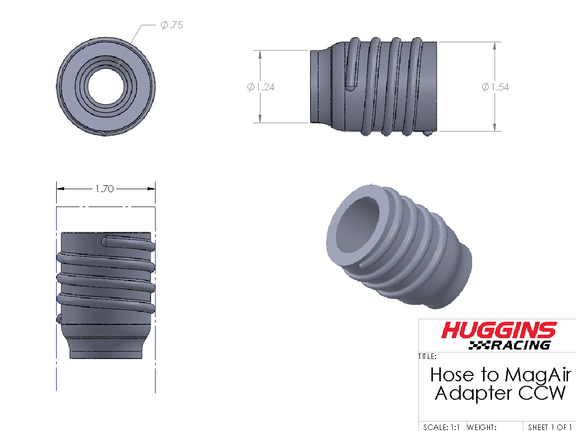 4. 1.5″ CCW Hose – Adapts from MagAir system to a 1.5″ Spiral Wound air hose. CCW is the most common winding direction. Left-Hand threads to tighten adapter into the hose.